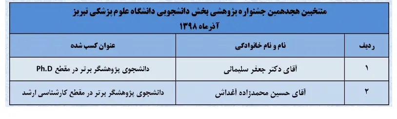 بدینوسیله به اطلاع می رساند جناب آقای حسین محمدزاده آغداش بعنوان پژوهشگر برتر Undergraduate هجدهمین جشنواره پژوهشی دانشگاه در هفته پژوهش آذر ماه 98 انتخاب شدند. این انتخاب را خدمت ایشان و خانواده محترمشان تبریک عرض نموده و آرزوی توفیقات روزافزونشان را داریم.