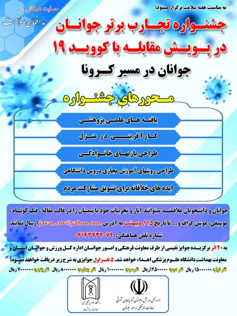 برگزاری جشنواره تجارب برتر جوانان در پویش مقابله با کووید 19 با همکاری مرکز بهداشت و سازمان ورزش جوانان استان آذربایجان شرقی