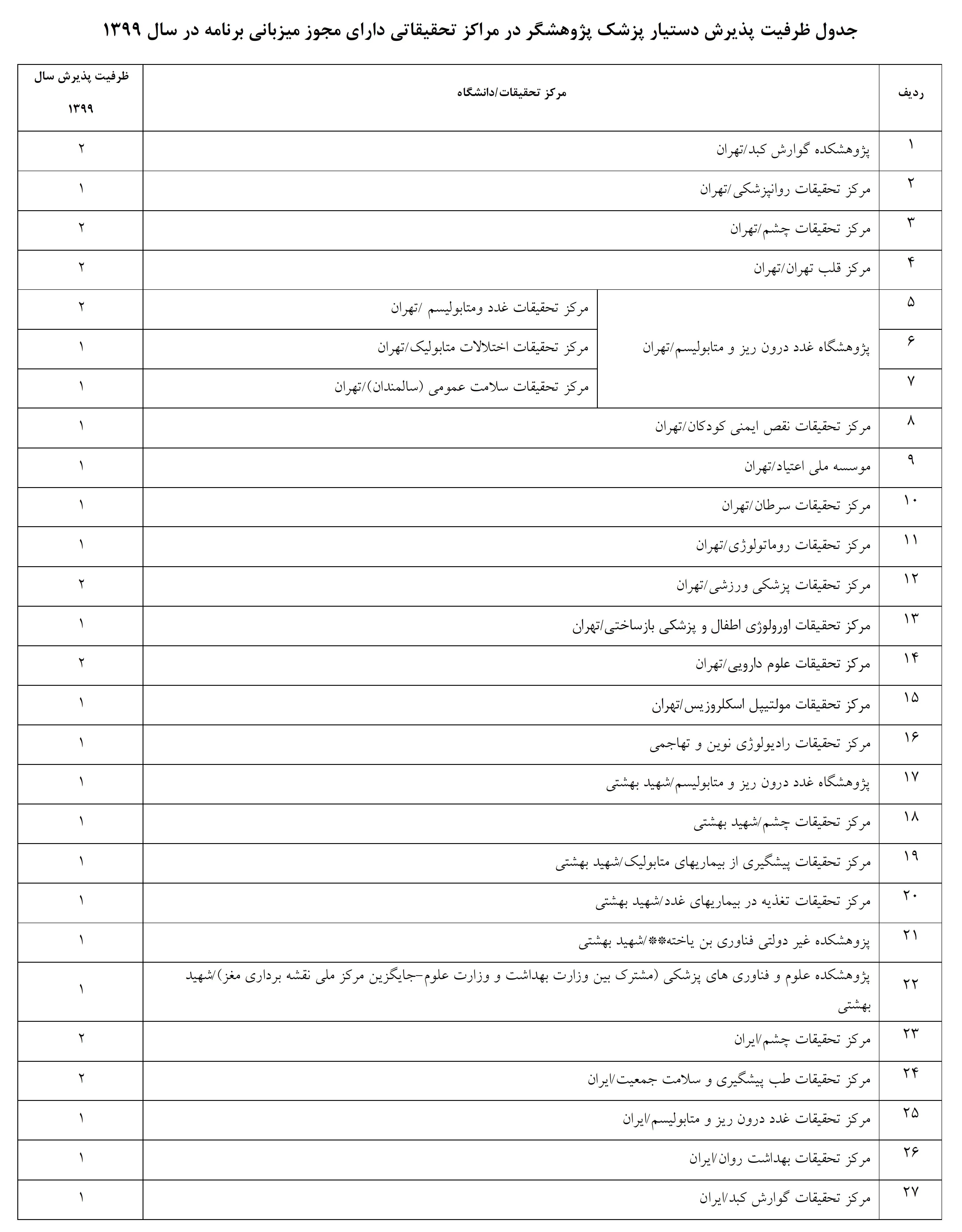 زمان ثبت نام هفتمین فراخوان جذب جهت برنامه دستیار پزشک پژوهشگر تا آخر تیرماه سال ۱۳۹۹ تمدید گردید.