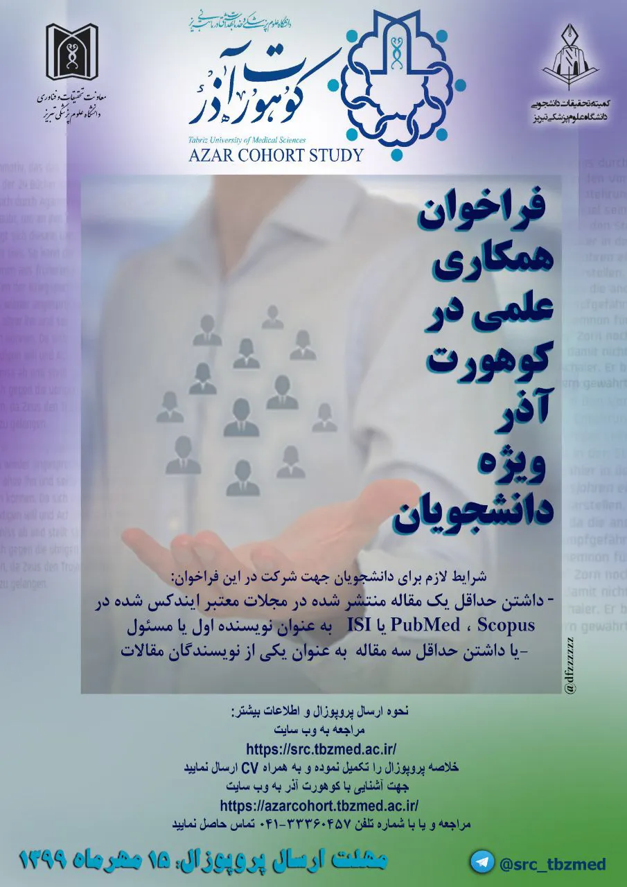 به گزارش روابط عمومی دانشگاه علوم پزشکی تبریز به نقل از روابط عمومی معاونت تحقیقات و فناوری دانشگاه، مرکز تحقیقات دانشجویی با اعلام فراخوان همکاری علمی در کوهورت آذر از دانشجویان دعوت به همکاری نمود. مهلت ارسال پروپوزال به این فراخوان 15 مهرماه 1399 اعلام شده است.