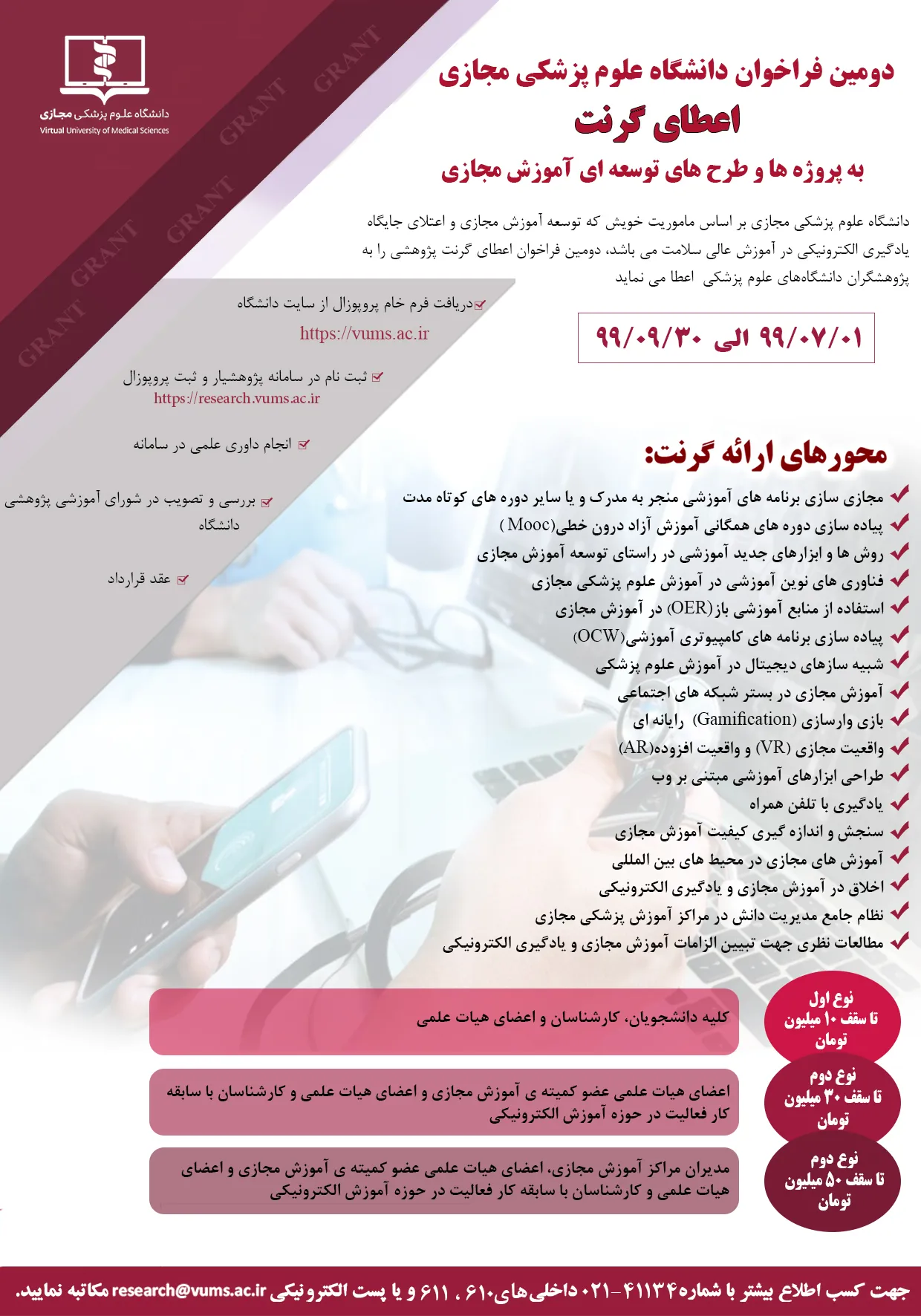 دانشگاه علوم پزشکی مجازی در راستای تحقق اهداف عالی برنامه توسعه آموزش مجازی و اعتلای جایگاه یادگیری الکترونیکی در آموزش عالی سلامت، در نظر دارد به دانشگاههای علوم پزشکی و موسسات مرتبط با آموزش عالی سلامت کشور در محورهای زیر گرانت پژوهشی اعطا کند.