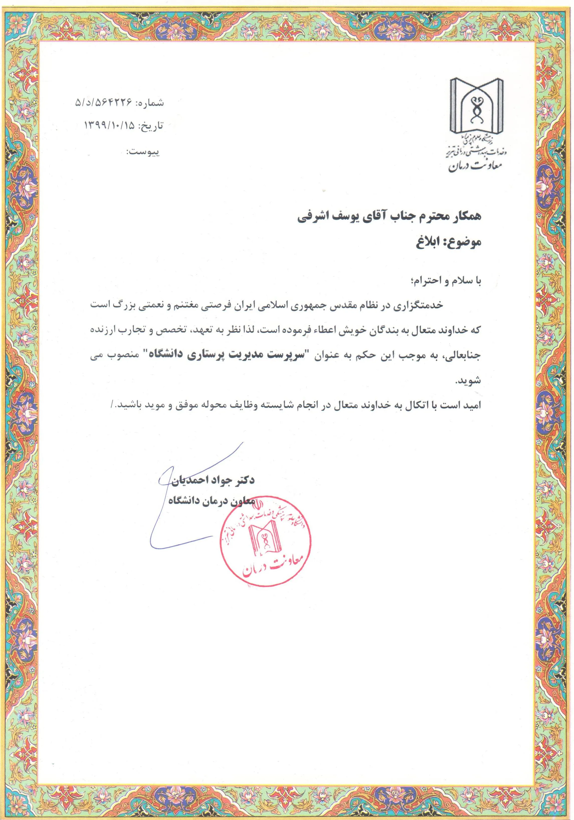 طی حکم صادره از سوی دکتر احمدیان معاون درمان دانشگاه علوم پزشکی تبریز، یوسف اشرفی به سمت مدیرپرستاری دانشگاه منصوب شد.