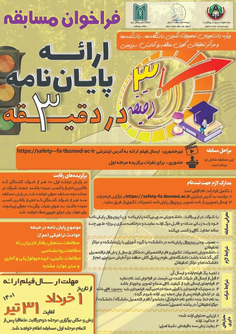 مرکز تحقیقات مدیریت و پیشگیری از مصدومیتهای حوادث ترافیکی دانشگاه علوم پزشکی تبریز در نظر دارد به منظور ارتقای مهارت دانشجویان در خلاصه سازی و انتقال یک مطلب علمی در کوتاهترین زمان و با زبان ساده و قابل درک، مسابقهای تحت عنوان "ارائه پایان نامه در 3 دقیقه" را برای دانشجویان برگزار کند