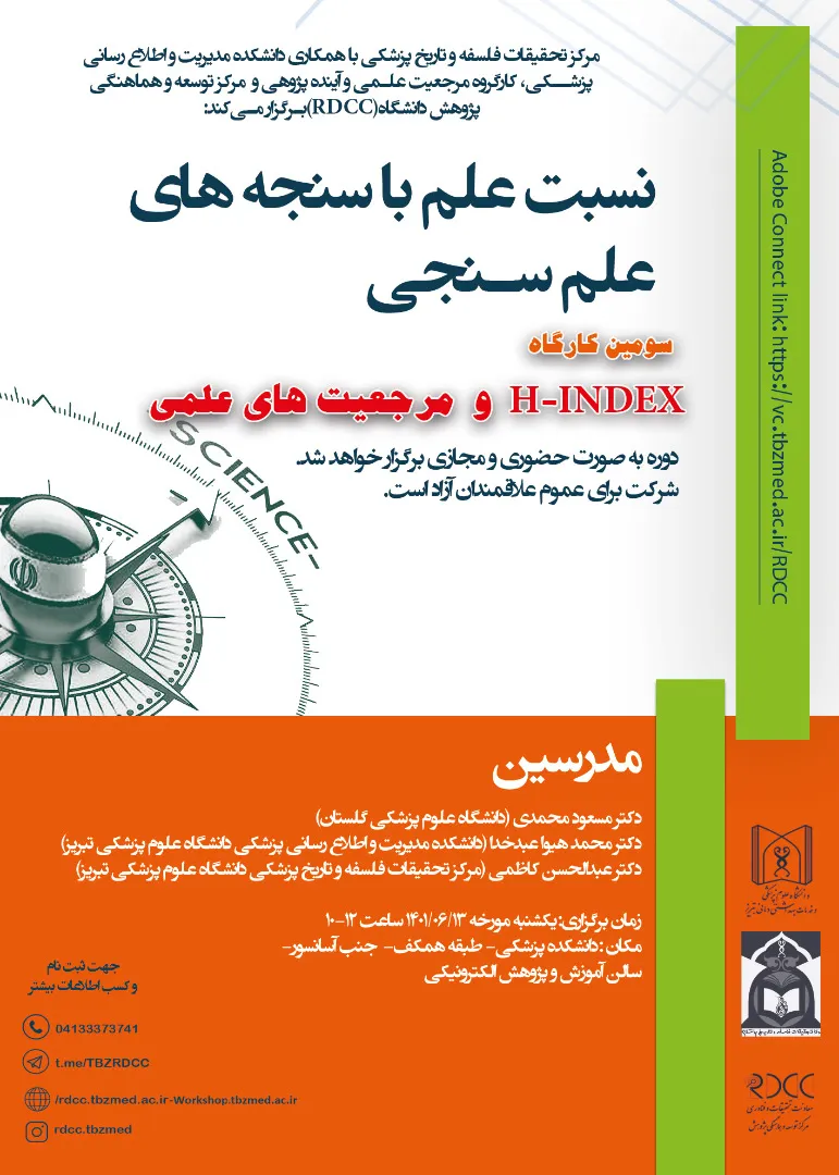 جلسه سوم کارگاه های فوق الذکر با تاکید و تمرکز بر H-INDEX و مرجعیت های علمی با امکان شرکت علاقمندان بصورت حضوری و مجازی برگزار می شود.