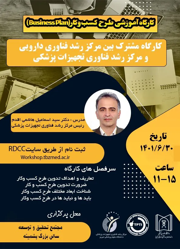 کارگاه آموزشی طرح کسب و کار (Business Plan) بصورت مشترک با همکاری مرکز رشد فناوری دارویی و مرکز رشد فناوری تجهیزات پزشکی دانشگاه علوم پزشکی تبریز، سی ام شهریورماه سال 1401 برگزار می شود.