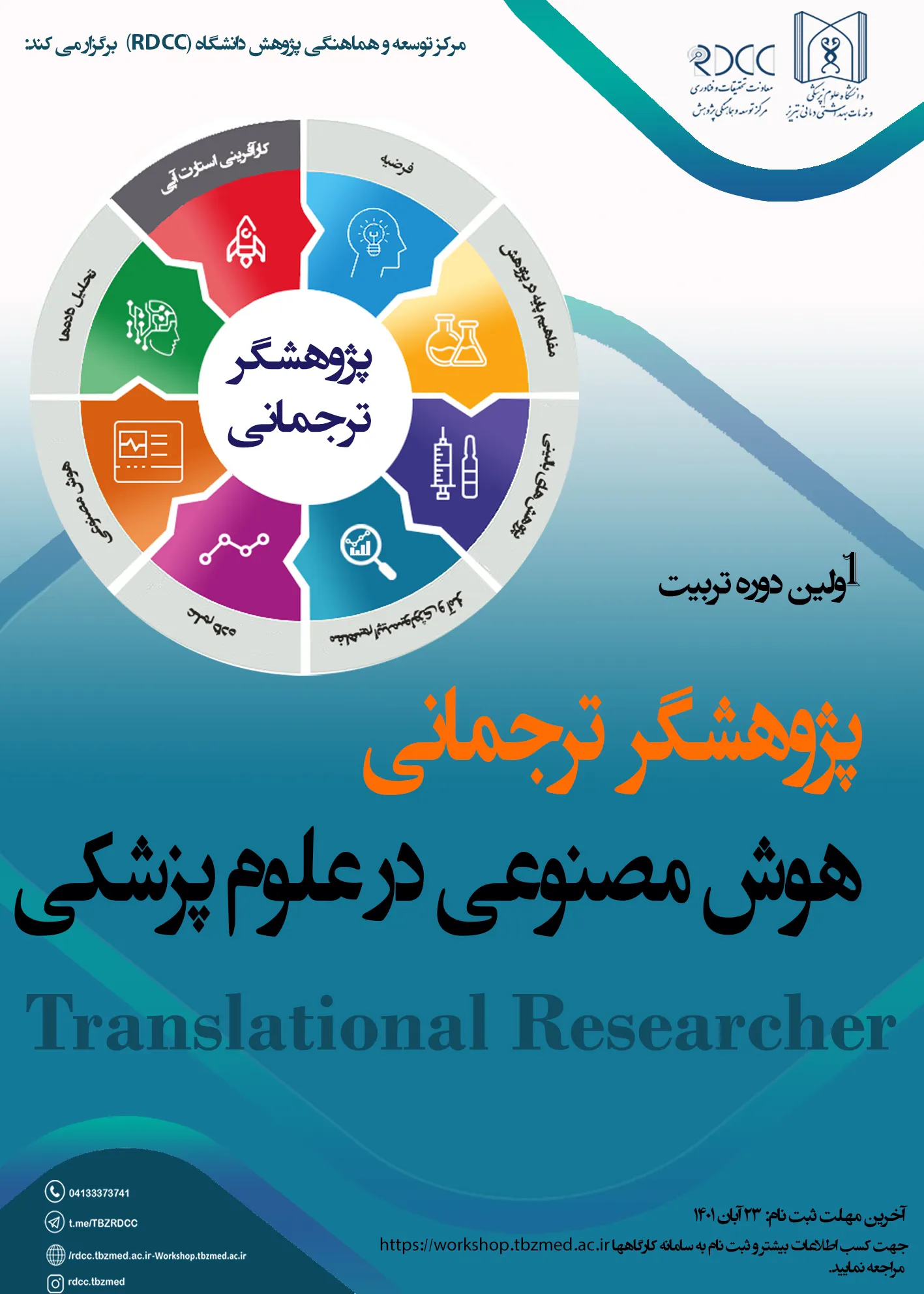 اولین دوره تربیت پژوهشگر ترجمانی هوش مصنوعی در علوم پزشکی توسط مرکز توسعه و هماهنگی پژوهش دانشگاه علوم پزشکی تبریز (RDCC) از 28 آبان ماه 1401 برگزار می شود و آخرین مهلت ثبت نام در دوره و ارسال رزومه، 19 آبان ماه 1401 می باشد.