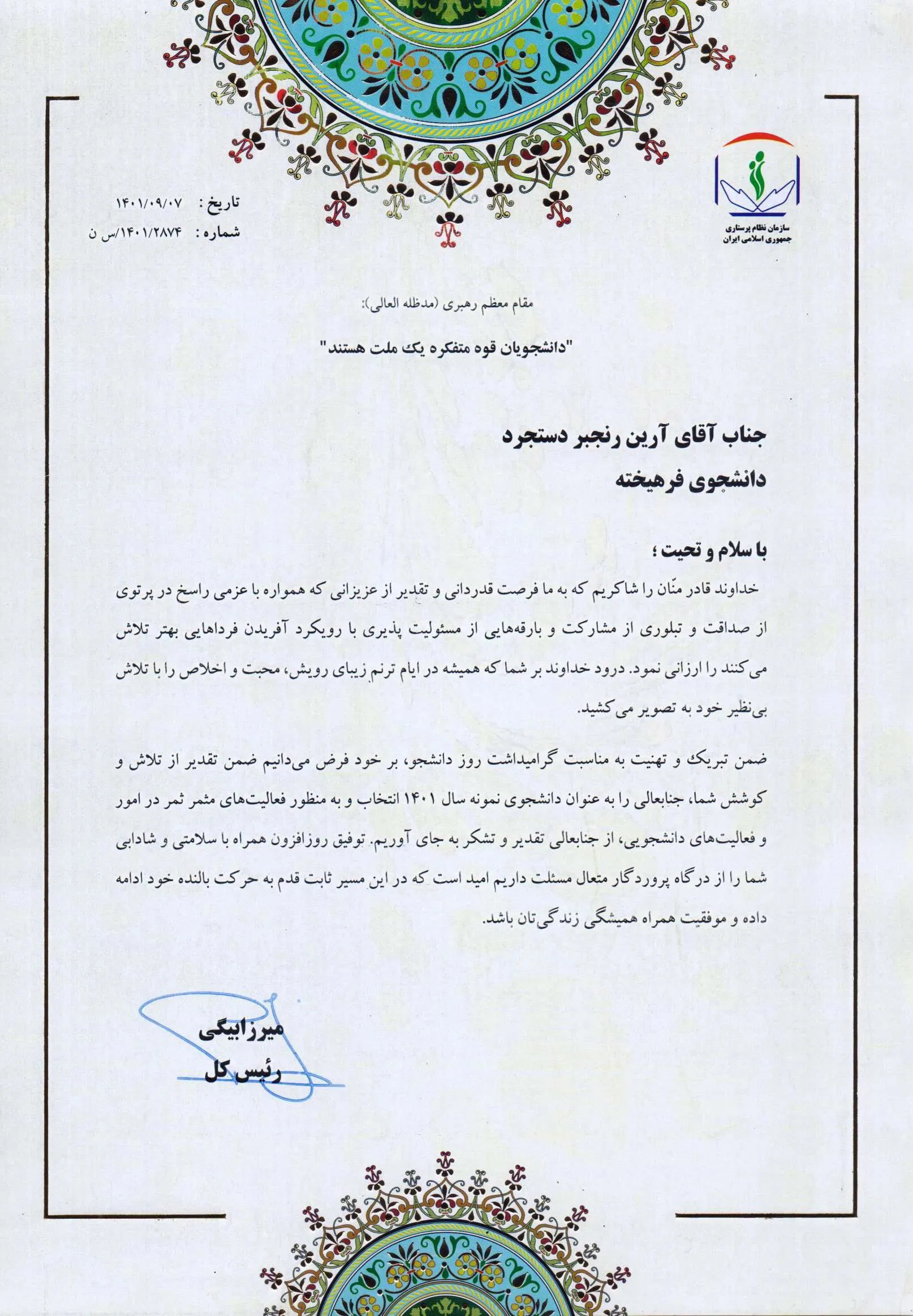 به گزارش روابط عمومی دانشگاه علوم پزشکی تبریز به نقل از روابط عمومی دانشکده پرستاری و مامائی تبریز، در لوح صادره ازسوی دکتر میرزابیگی رئیس سازمان نظام پرستاری کشور، فعالیت های مثمرثمر در امور و فعالیت های دانشجویی را علت انتخاب آرین رنجیر به عنوان دانشجوی نمونه سال 1401 عنوان شده است.