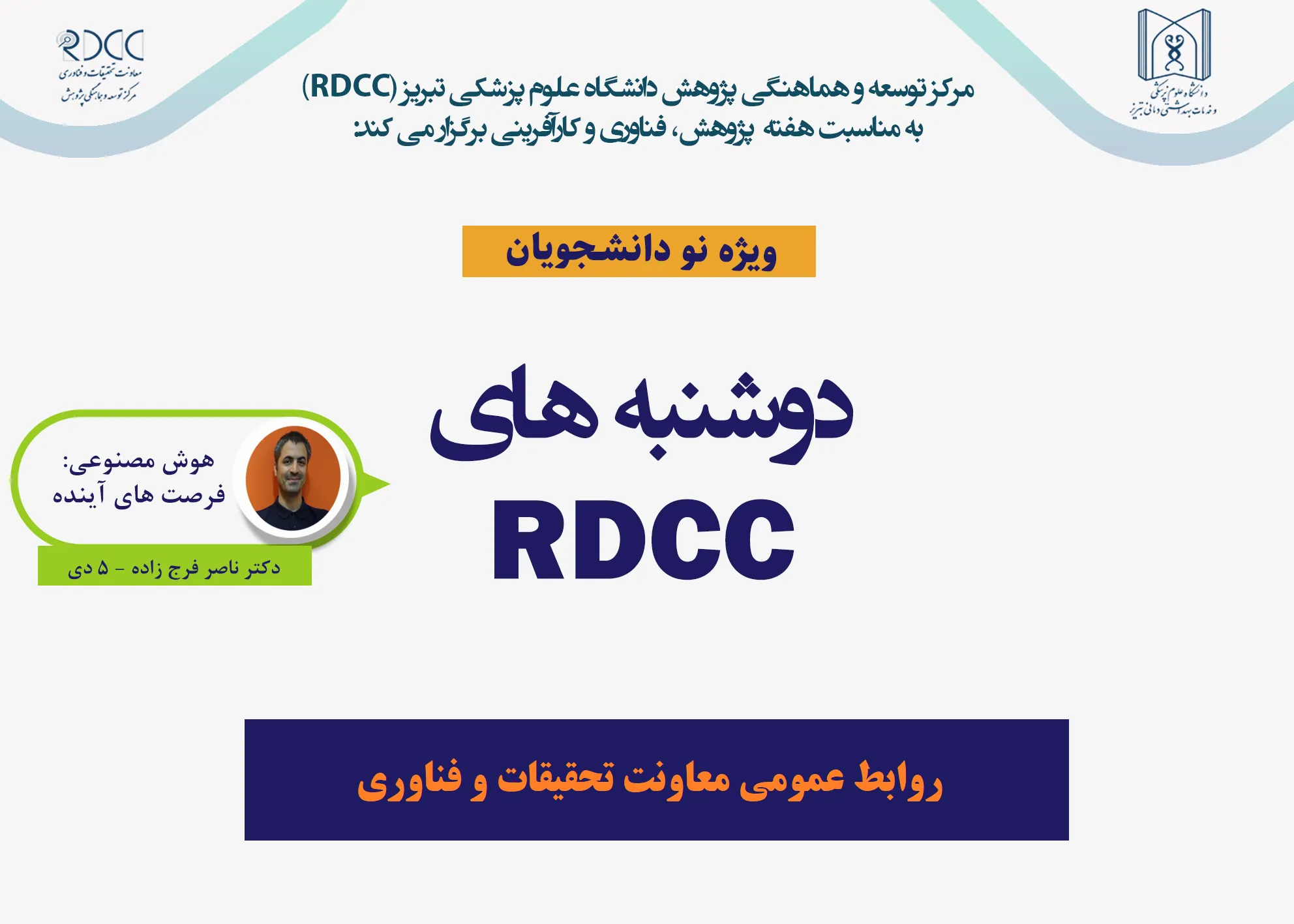 در ادامه ی دوشنبه های RDCC ، مرکز توسعه و هماهنگی پژوهش دانشگاه علوم پزشکی تبریز روز دوشنبه 5 دیماه 1401 نشست علمی - پژوهشی با عنوان "هوش مصنوعی: فرصت های آینده" را برگزار می کند.