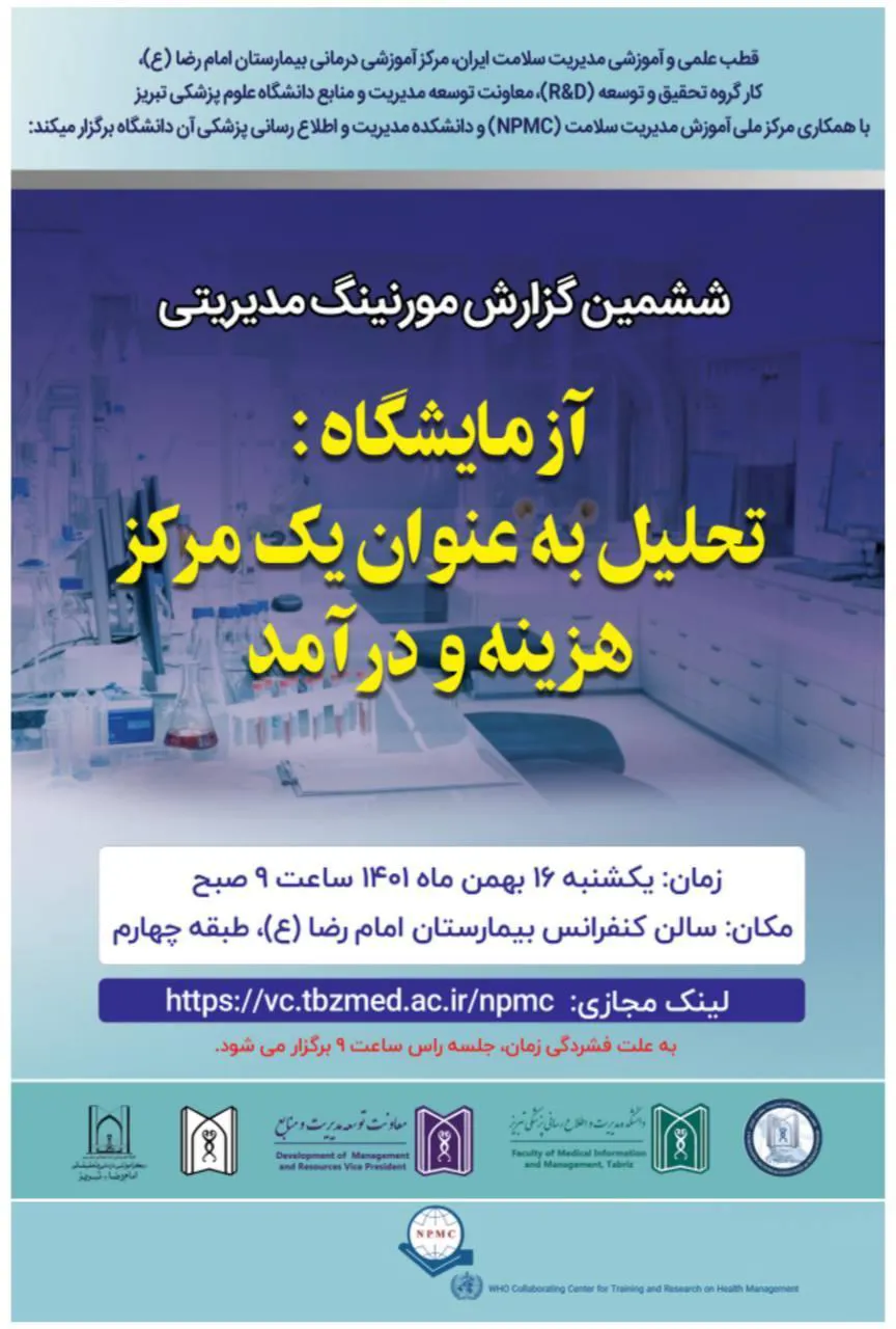 به گزارش روابط عمومی دانشگاه علوم پزشکی تبریز در ادامه دورههای گزارش مورنینگ مدیریتی ، ششمین مورنینگ مدیریتی با همکاری مراکز علمی دانشگاه و نیز مرکز ملی آموزش مدیریت سلامت (NPMC) دانشگاه علوم پزشکی تبریز برگزار میشود، عنوان مورنینگ مدیریتی این جلسه به «آزمایشگاه: تحلیل به عنوان یک مرکز هزینه و درآمد» اختصاص یافته است که در روز یکشنبه تاریخ 1401/11/16 ساعت 9 الی 11 صبح در بستر مجازی آدوب کانکت به آدرس: https://vc.tbzmed.ac.ir/npmc اجرا خواهد گردید.
