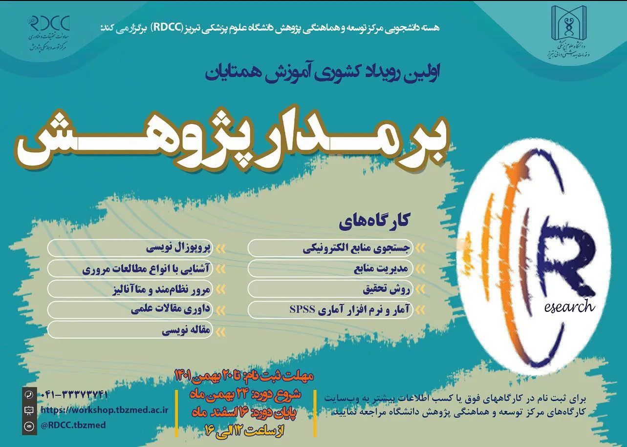 هسته دانشجویی مرکز توسعه و هماهنگی پژوهش دانشگاه علوم پزشکی تبریز (RDCC) برگزار می کند: