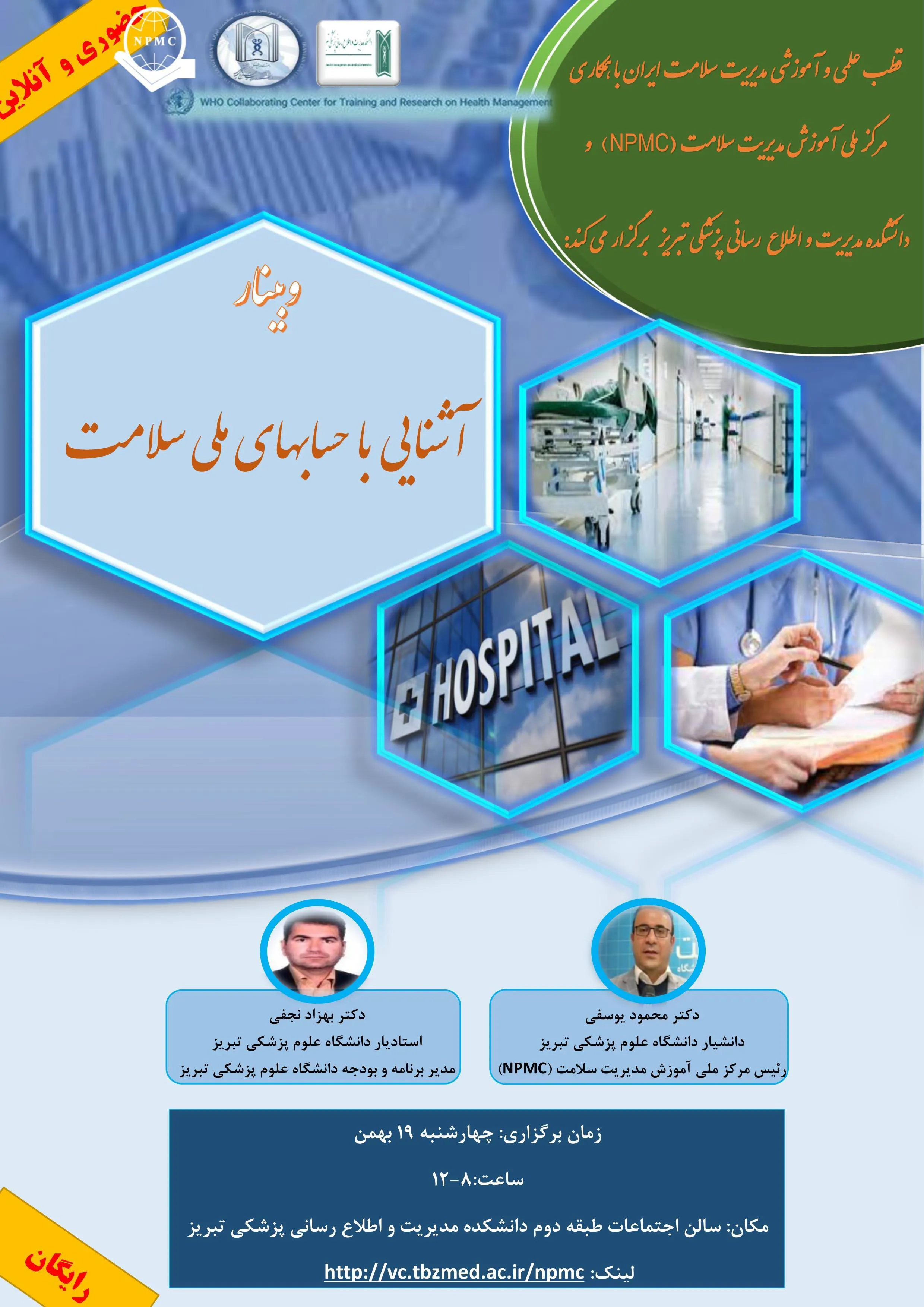 مرکز ملی آموزش مدیریت سلامت (NPMC) دانشگاه علوم پزشکی تبریز با همکاری قطب علمی و آموزشی سلامت ایران و دانشکده مدیریت و اطلاع رسانی پزشکی تبریز، وبینار «آشنایی با حسابهای ملی سلامت» را در روز چهارشنبه تاریخ 1401/11/19 ساعت 8 صبح الی 12 ظهر در بستر مجازی آدوب کانکت به آدرس زیر اجرا خواهد نمود.