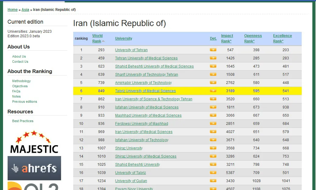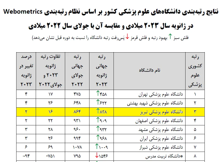 به گزارش روابط عمومی دانشگاه علوم پزشکی تبریز به نقل از روابط عمومی معاونت تحقیقات و فناوری وزارت بهداشت، دکتر یونس پناهی با اعلام این خبر اظهار داشت: در بازه زمانی ژانویه و جولای سال های 2023 و 2022 نتایج رتبه بندی دانشگاههای علوم پزشکی کشور در نظام رتبهبندی Webometrics نشان میدهد که سه دانشگاه علوم پزشکی تهران با 17 پله صعود نسبت به سال گذشته رتبه اول، دانشگاه علوم پزشکی شهید بهشتی با 26 پله ارتقا رتبه دوم و دانشگاه علوم پزشکی تبریز با 16 پله رشد جایگاه سوم را کسب کرده اند.