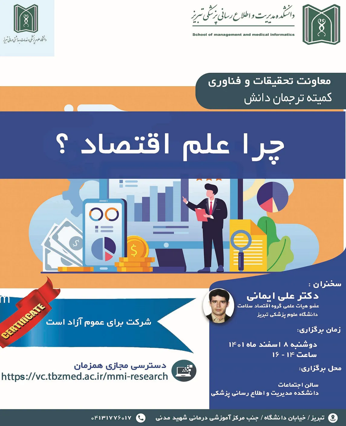 به گزارش روابط عمومی معاونت تحقیقات و فناوری دانشگاه علوم پزشکی تبریز به نقل از دانشکده مدیریت و اطلاع رسانی پزشکی دانشگاه، این دانشکده روز دوشنبه هشتم اسفند ماه 1401 از ساعت 14 الی 16 وبینار کمیته ترجمان دانش با موضوع " چرا علم اقتصاد؟ " را با تدریس دکتر علی ایمانی، استاد گروه اقتصاد سلامت دانشکده مدیریت و اطلاع رسانی پزشکی در سالن اجتماعات دانشکده به صورت حضوری و مجازی برگزار می کند .