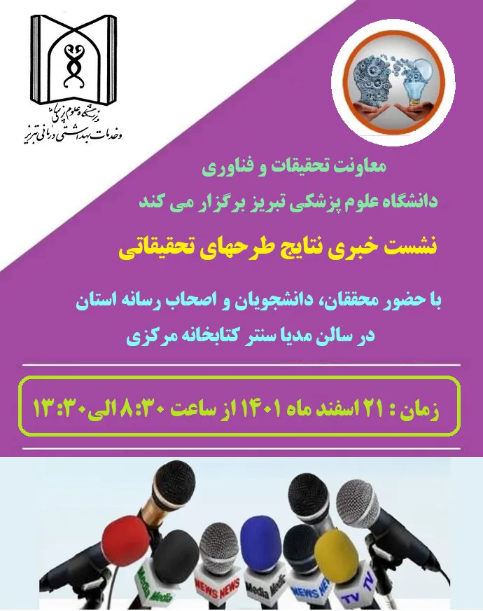 در راستای کاربردی کردن نتایج پژوهشهای سلامت، معاونت تحقیقات و فناوری دانشگاه علوم پزشکی تبریز، نشست خبری نتایج طرحهای تحقیقاتی را با حضور محققان، دانشجویان و اصحاب رسانه 21 اسفندماه در کتابخانه مرکزی برگزار می کند