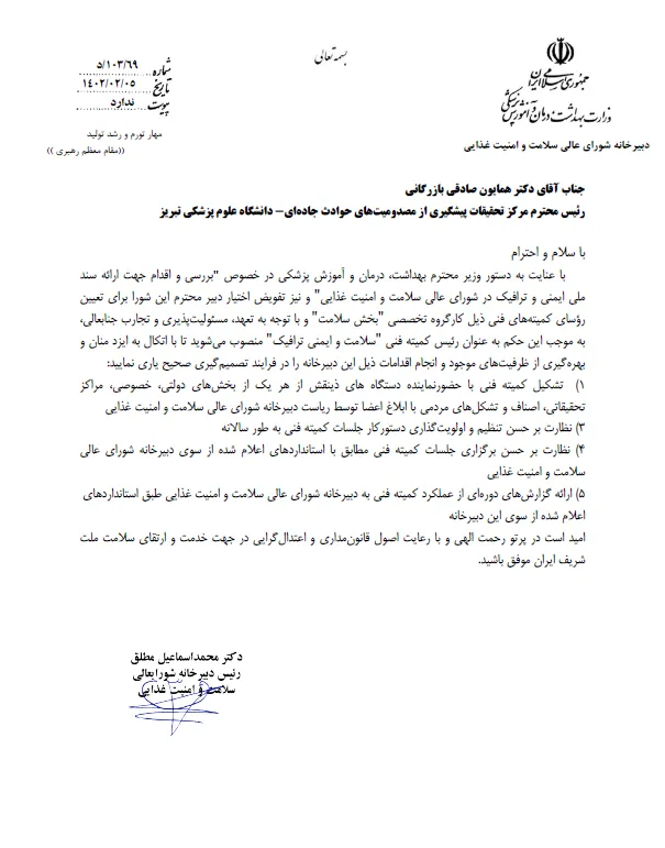 ابلاغ دکتر همایون صادقی بازرگانی به عنوان رئیس کمیته فنی "سلامت و ایمنی ترافیک" در شورای عالی سلامت و امنیت غذایی