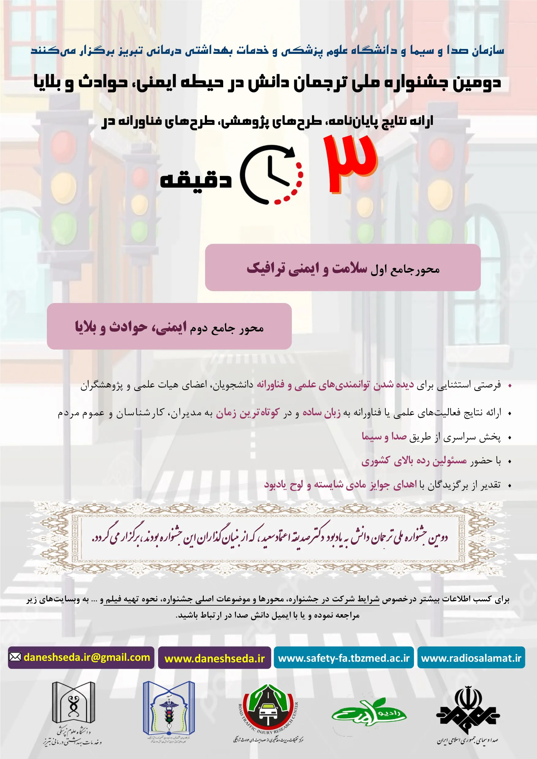 به گزارش روابط عمومی دانشگاه علوم پزشکی تبریز، در راستای ارتقای دانش سلامت و ایمنی به ویژه در حیطه ترافیک و ترجمان دانش برای گروه های هدف شامل مدیران، کارشناسان و عموم مردم، جشنواره سالانه کشوری ترجمان دانش ایمنی، حوادث و بلایا برگزار میشود.
