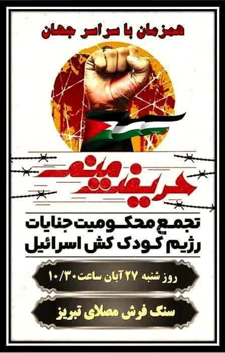تجمع محکومیت جنایات رژیم جعلی و منحوس و کودک کش صهیونیستی همزمان با سراسر کشور امروز در محل سنگ فرش مصلی امام خمینی ره تبریز بر گزار می شود.