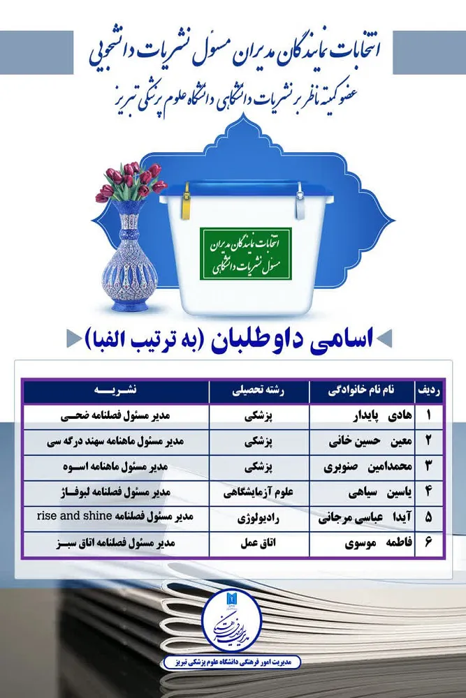 خانه نشریات مدیریت امور فرهنگی دانشگاه علوم پزشکی تبریز، انتخابات نمایندگان مدیران مسئول نشریات دانشگاهی را روز نهم اسفند ماه سال ۱۴۰۲ از ساعت ۱۰ الی ۱۴ در محل مجتمع فرهنگی رفاهی امید، مدیریت فرهنگی، خانه نشریات دانشجویی برگزار می کند.