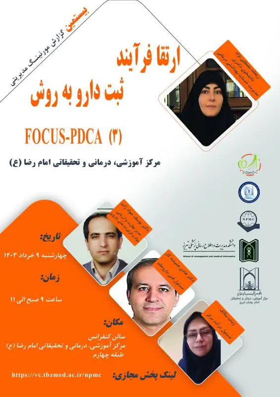 به گزارش روابط عمومی دانشگاه علوم پزشکی تبریز، مرکز ملی آموزش مدیریت سلامت با همکاری قطب مدیریت خدمات بهداشتی و درمانی و معاونت توسعه علوم پزشکی تبریز، بیستمین مورنینگ مدیریتی با عنوان «ارتقاء فرآیند ثبت دارو به روش FOCUS-PDCA (3)» را روز چهارشنبه نهم خرداد ماه 1403 از ساعت 9 الی 11 صبح در بستر مجازی آدوب کانکت به آدرس زیر برگزار می کند.