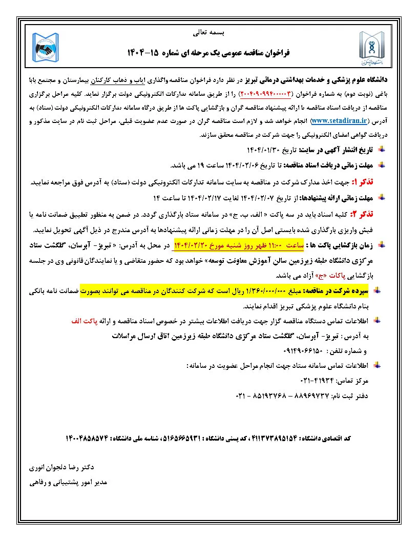 انتشار آگهی مناقصه دانشگاه علوم پزشکی تبریز